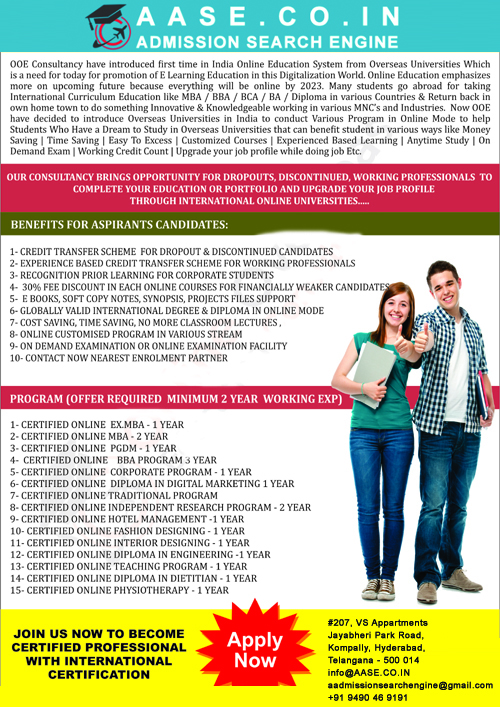 OUR CONSULTANCY BRINGS OPPORTUNITY FOR DROPOUTS, DISCONTINUED, WORKING PROFESSIONALS TO COMPLETE YOUR EDUCATION OR PORTFOLIO AND UPGRADE YOUR JOB PROFILE THROUGH INTERNATIONAL ONLINE UNIVERSITIES
